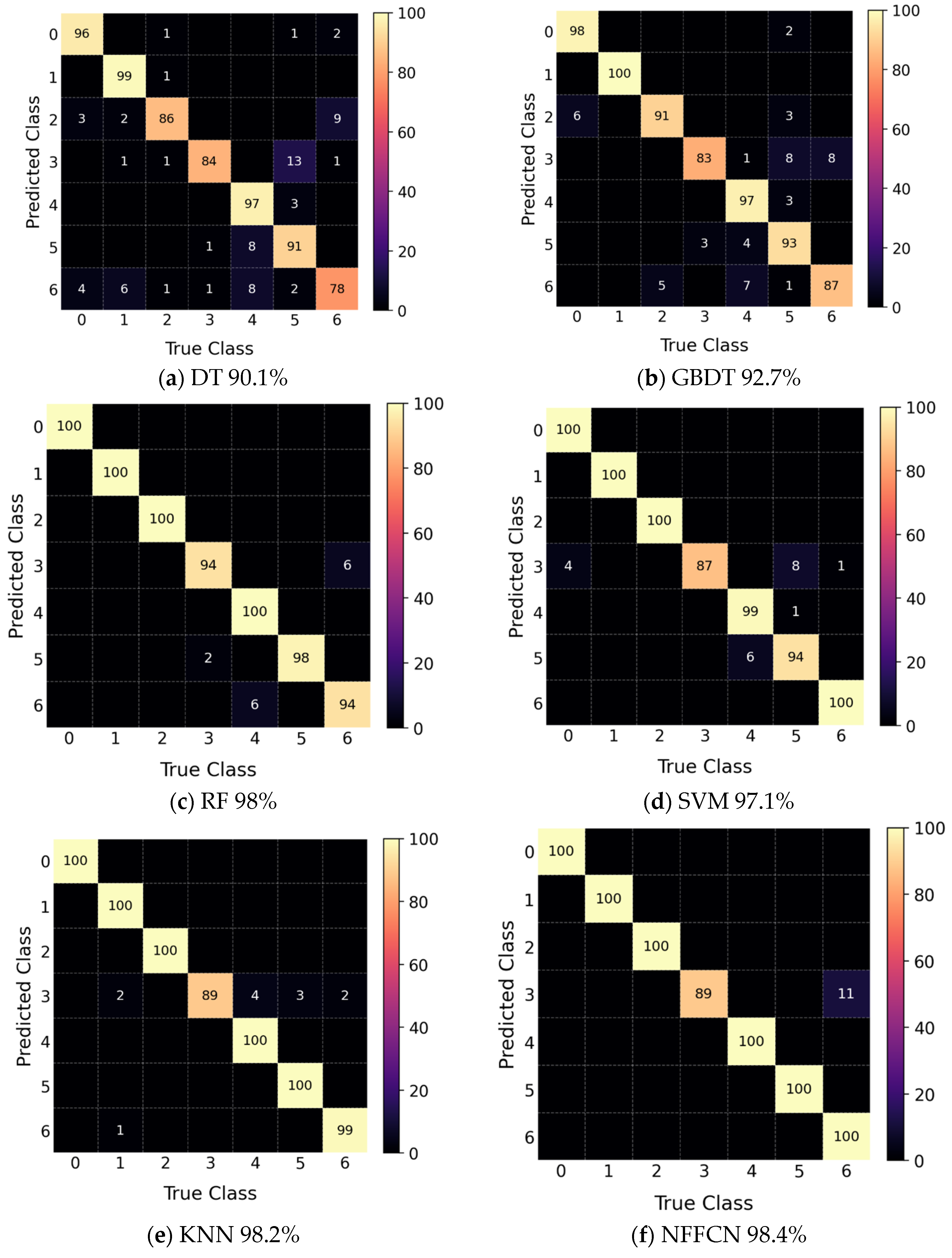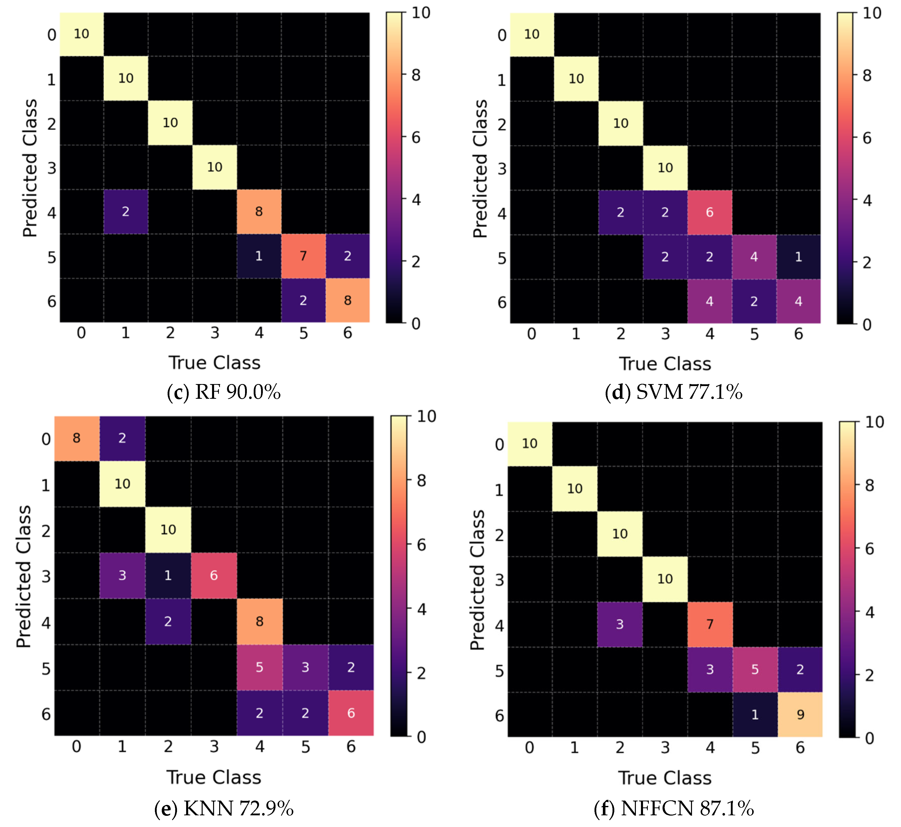(1) The base sensing module NFFCN is proposed; NFFCN is an improved method based on Random Forest. This method has the characteristics of high computational efficiency and optimized classification structure. Its classification effect is comparable to models such as RF and GDBT, but NFFCN has better generalization ability and can better adapt to complex wireless sensing environments.