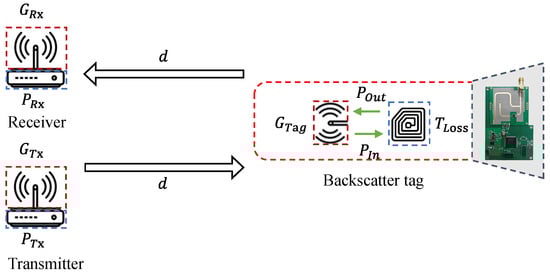 The backscatter communication process can be characterized by two sequential propagation stages. In the first stage, the transmitter radiates an excitation signal from an omnidirectional antenna, and this signal undergoes propagation loss before reaching the tag. The tag intercepts the incident signal with its own omnidirectional antenna; then, the received signal is reflected from the antenna port after modulation by the tag’s internal circuitry. Denoting the propagation distance for this stage as d, the associated attenuation can be expressed by the electromagnetic propagation loss relation as follows: