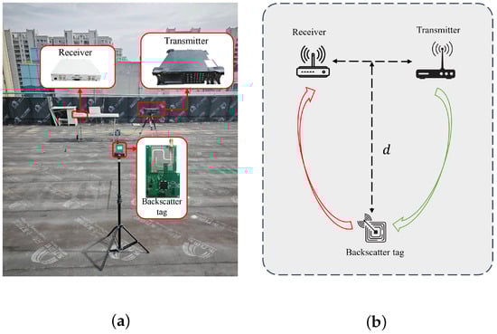 Impact of Transmitter–Receiver Distance: The distance between the excitation source and the receiver influences the power level at which the excitation signal arrives at the receiver, which in turn affects the performance of the receiver’s low-noise amplifier (LNA). Consequently, it is imperative to ascertain the impact of varying this distance on overall system performance to inform appropriate adjustments in deployment strategies, ensuring optimal positioning for reliable communication. The tag was placed at the maximum distance of 14 m away from the receiver for testing, as depicted in Figure 8a; the system’s BER decreased gradually as the distance between the excitation source and the receiver increased, stabilizing after reaching a distance of 4 m with no further changes observed. Additionally, we introduced a metal barrier between the excitation source and the receiver as a physical isolation measure, and the resultant test outcomes, as shown in Figure 8b, confirm that such physical barriers can effectively mitigate interference to a considerable extent.