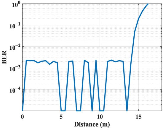 Communication Distance: In this study, we conducted experiments to test the system in real-world scenarios in terms of BER versus distance and maximum communication distance. As shown in Figure 6, our experimental results show that the BER is essentially 0 within 14 m, but suddenly rises after 14 m. It can be assumed that 14 m is the maximum distance of our system. Notably, within the communication range of 0–15 m, subtle periodic fluctuations in BER are observed, with an amplitude of less than 0.001. This phenomenon can be primarily ascribed to two key contributing factors: