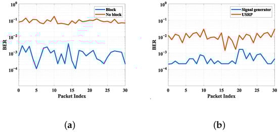 (a) BER under conditions with and without a block; (b) BER under the conditions of a USRP or signal source as the excitation source.