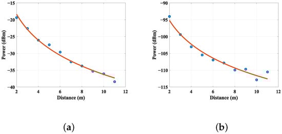 The fitting curve for the first phase’s attenuation coefficient is illustrated in Figure 9a, with the attenuation coefficient estimated through least squares fitting being 2.56. The inferred transmitted power dBm is lower than the actual configured signal transmission power of 26 dBm (considering the transmitting antenna and the receiving antenna gain as a standard gain of 3 dBi). Similarly, Figure 9b shows the second phase of the fitting curve, and . The inferred transmitted power of dBm is lower than the actual configured signal transmission power of −56.2 dBm. The tag insertion loss can be extrapolated from the above results. Since the antenna gain is non-standard gain and is involved in the fitting as an overall parameter, it is easy to obtain dB. Through estimating dB and dB from the test results, dB.