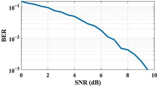 To characterize the ambient noise floor of the test environment, measurements were conducted during three separate time periods using two distinct spectrum analyzers: a portable TinySA unit (manufactured by Shenzhen XSH Smart Technology Co., Ltd., Shenzhen, Guangdong, China) and a more advanced RIGOL-RSA5065 analyzer (manufactured by RIGOL Technologies, Inc., Beijing, China). These measurements were performed in conjunction with various receiving antennas. Our findings reveal an average noise floor on the rooftop hovering around −124 dBm when measured over a bandwidth of 2 kHz. Then, we conducted a simulation study to analyze the demodulation threshold of our algorithm. By simulating the relationship between the system’s SNR and BER, we derived the following results. As illustrated in Figure 10, the system’s BER decreases to the orders of magnitude of at an SNR greater than 7 dB. Since it can be considered to have essentially no effect on communications at orders of magnitude of , we posit that the theoretical demodulation SNR threshold for our system is practically at 7 dB. Consequently, when the antenna gain is standard, the total link attenuation formula can be delineated as follows: