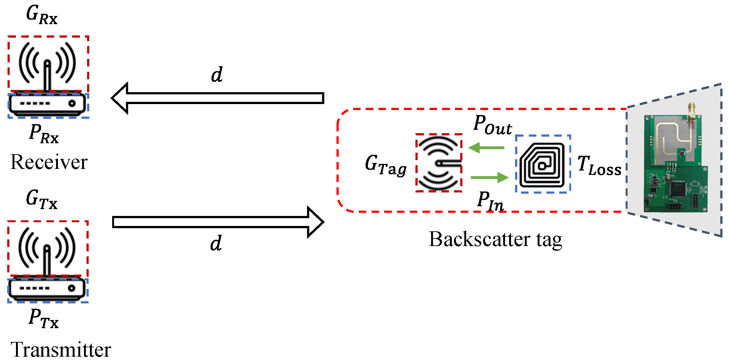 Unlike conventional wireless communication models that assume a single reciprocal link between transmitter and receiver, backscatter communication involves two separate propagation paths: a forward channel from the transmitter to the tag and a backward channel from the tag to the receiver. As a result, an accurate link budget must incorporate hardware-dependent parameters such as tag insertion loss and antenna gains, which directly affect end-to-end signal strength. The architecture of the FSK-based backscatter system is shown in