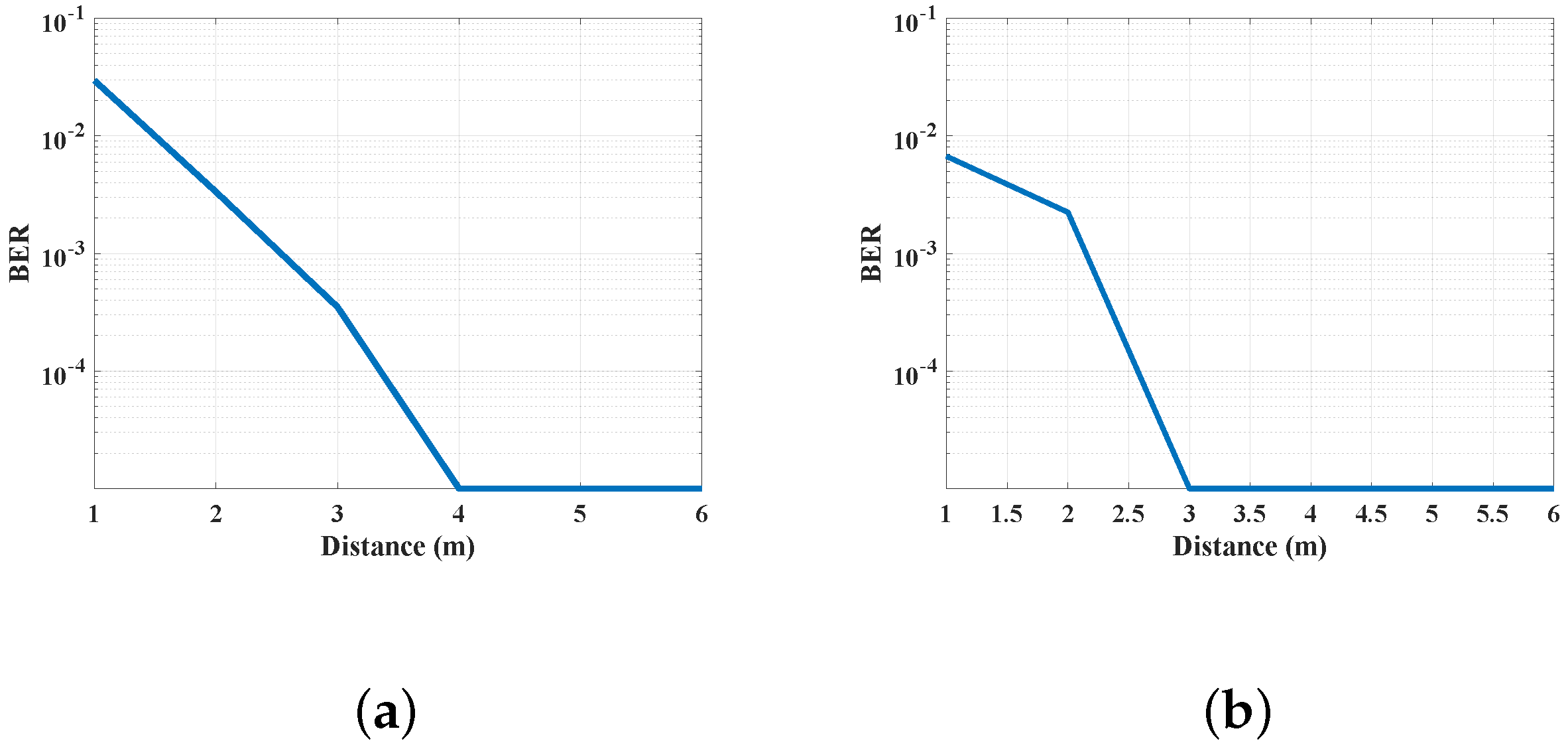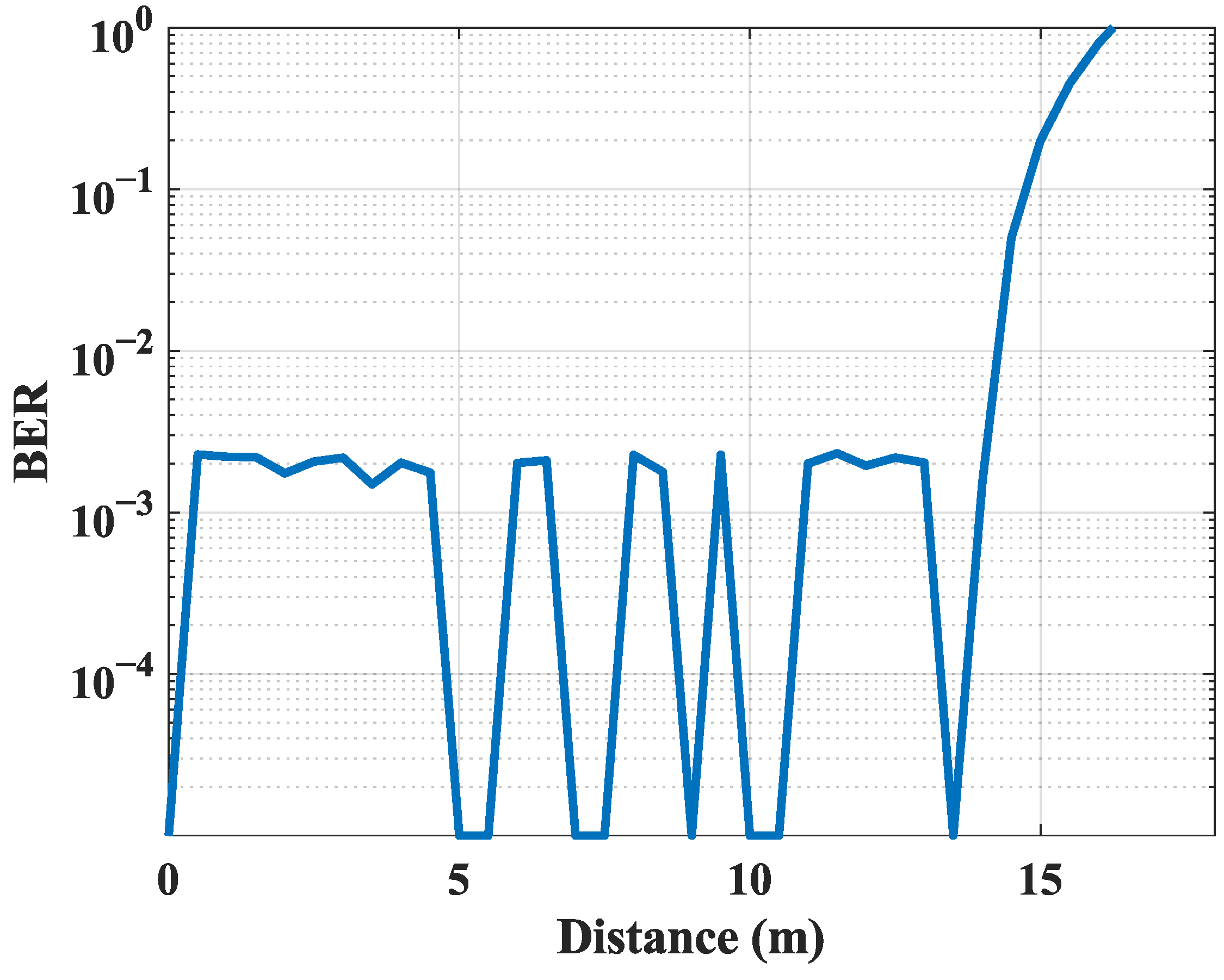 Figure 6, our experimental results show that the BER is essentially 0 within 14 m, but suddenly rises after 14 m. It can be assumed that 14 m is the maximum distance of our system. Notably, within the communication range of 0–15 m, subtle periodic fluctuations in BER are observed, with an amplitude of less than 0.001. This phenomenon can be primarily ascribed to two key contributing factors: