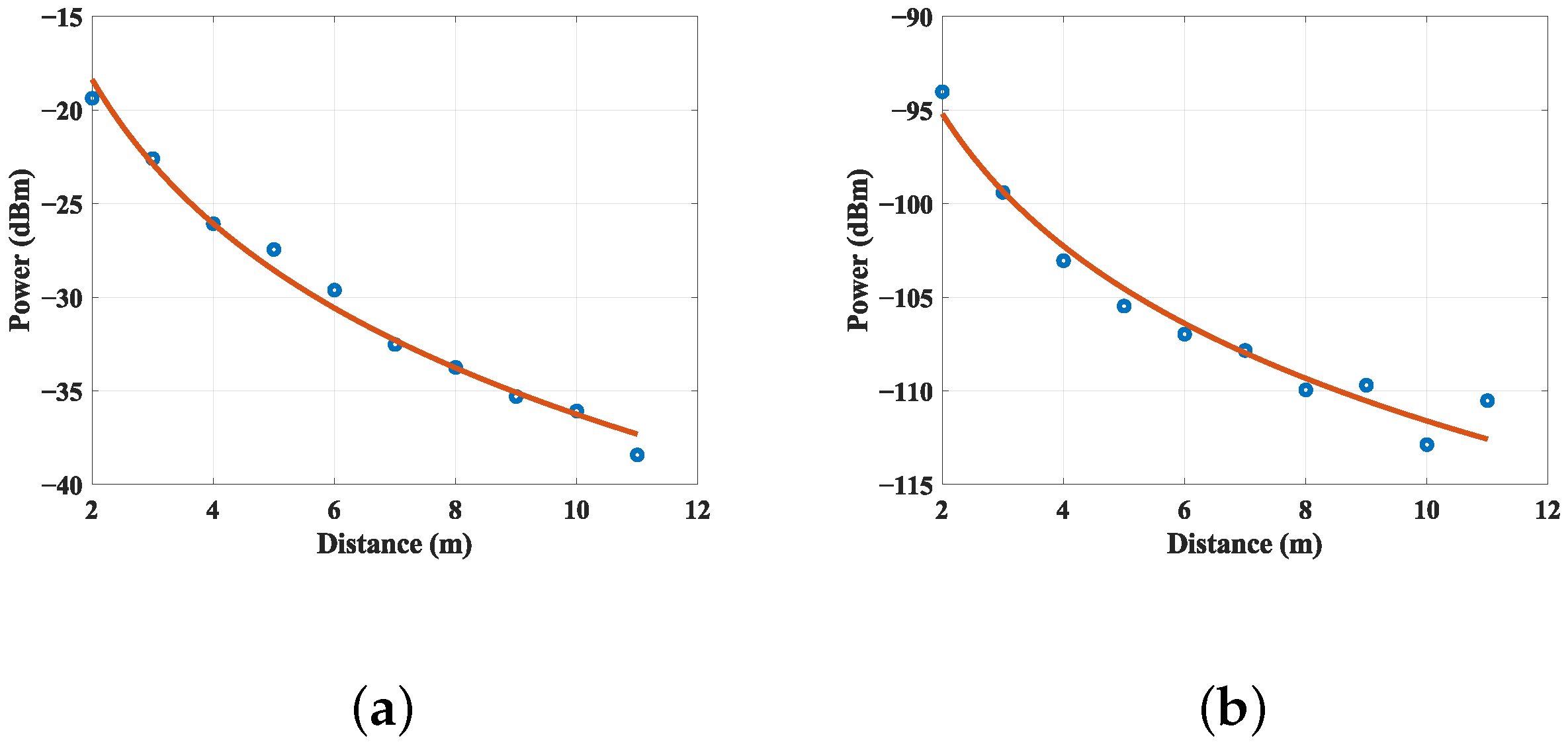 To obtain the power decay trend with respect to distance, we configure the attenuation coefficients of both propagation phases as parameters to be fitting. Leveraging test data, we employed the method of least squares fitting. Given the ambiguity surrounding the precise antenna gain values, we adopted a dual approach: firstly, we fixed the antenna gain at a nominal value of 3 dB for the fitting process; secondly, we treated the antenna gain as an additional parameter to be concurrently fitting alongside the attenuation factors, thereby exploring the optimal fit under varying assumptions.