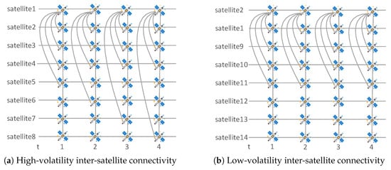 To illustrate the calculation of the satellite connectivity volatility coefficient, we consider an example with 14 LEO satellites. The edge connectivity states over four consecutive time slots are shown in Figure 1. LEO satellites 1 and 2 are selected as representative cases to analyze their connection dynamics. As shown in Figure 1a, LEO satellite 1 exhibits high link diversity. It connects to LEO satellites {2, 3, 4, 5}, {2, 3, 4, 6}, {2, 3, 4, 7}, and {2, 3, 4, 8} in time slots 1 through 4, respectively. The set of LEO satellites connected to LEO Satellite 1 is therefore . The ISL volatility coefficient of LEO Satellite 1 is calculated as follows: . In contrast, LEO satellite 2 maintains a consistent neighbor set across all time slots. As shown in Figure 1b, it connects to Satellites {1, 9, 10, 11} in all four time slots. Thus, its connected neighbor set is , and ISLs volatility coefficient is . Since , LEO satellite 2 exhibits more stable connectivity, implying fewer changes in ISL connections and a lower risk of service disruption during topology updates.