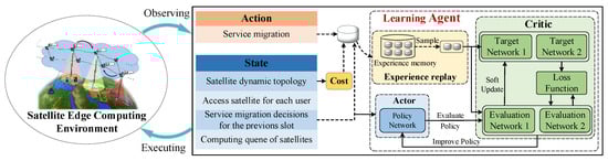 (1) State Space . The system state captures the dynamic status of the SEC network in each time slot t. It includes information about the satellite network topology, access satellites of users, computational workloads of LEO satellites, and historical service migration decisions. Specifically, as mentioned above, we denote as the satellite network topology, where V is the time-varying set of LEO satellites and is the set of ISLs. Access satellite information is denoted as , where indicates the access satellite for user u. Given the task queue length of LEO satellite n, we denote as the computational workload information. Finally, previous migration decisions are defined as , where denotes the service migration decision for user u’s required service in the previous time slot. Accordingly, the system state is defined as follows: