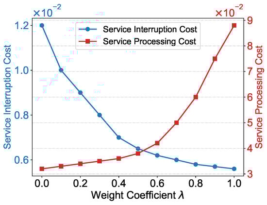 Effect of the weight coefficient . Increasing decreases service interruptions but increases processing cost, whereas a smaller yields the opposite trend. An intermediate value of provides a good trade-off between latency and migration overhead.