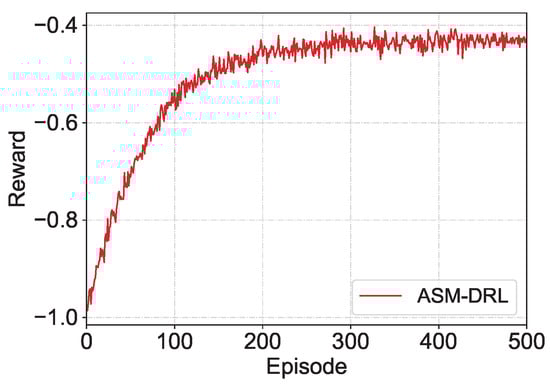 Convergence performance of ASM-DRL during training, where the cumulative reward stabilizes after approximately 300 episodes.