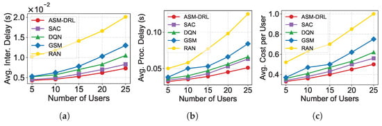 Performance comparison of ASM-DRL and baseline algorithms under different user numbers: (a) average service interruption delay, (b) average processing delay, and (c) average cost per user. ASM-DRL consistently achieves lower latency and cost, demonstrating superior advantages with increasing the number of users.