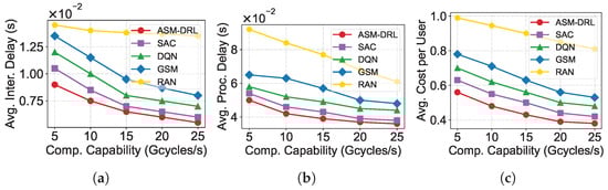 Performance comparison of ASM-DRL and baseline algorithms under varying satellite computing capabilities: (a) average service interruption delay, (b) average processing delay, and (c) average cost per user. As computing capability increases, all approaches achieve better performance, while ASM-DRL consistently maintains the best overall results.