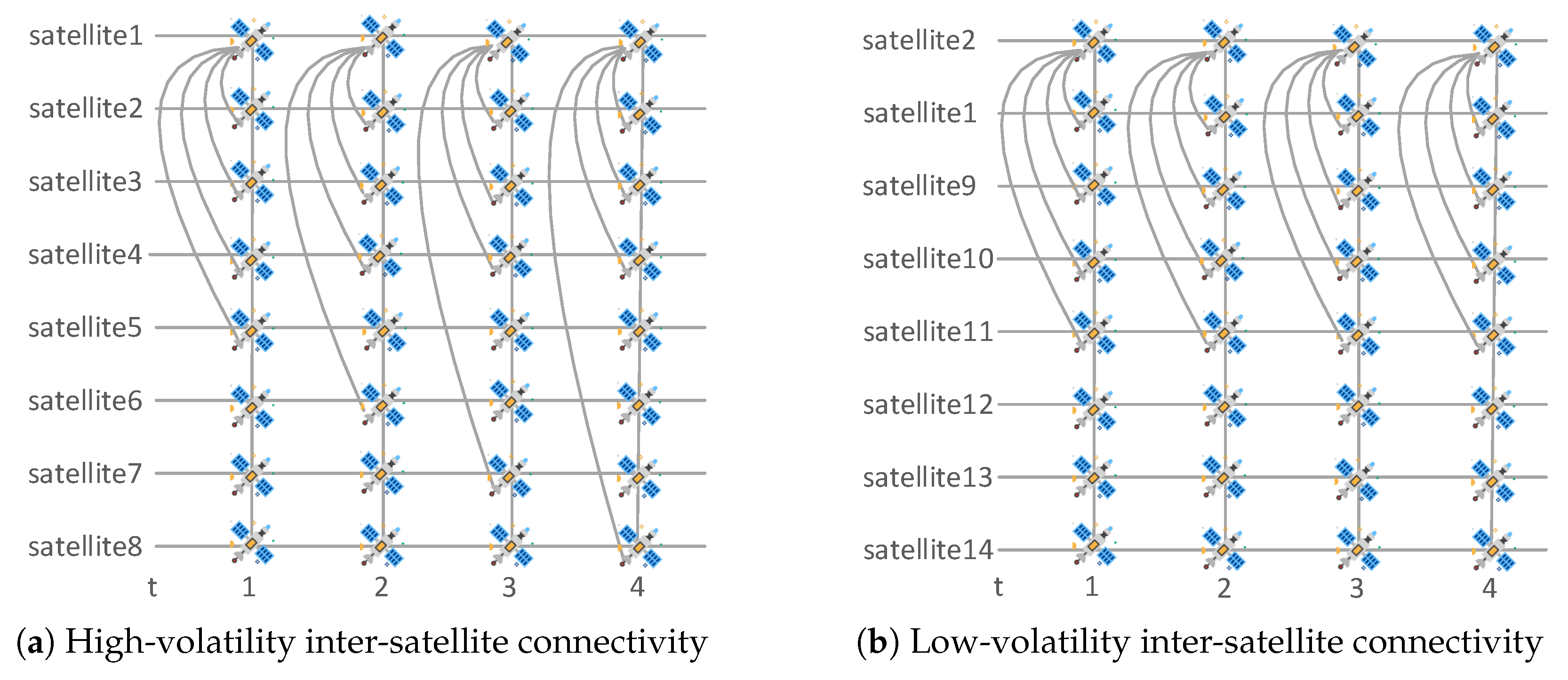 Figure 1. Illustration of ISL volatility in LEO satellite connectivity, where (a) the high-volatility case shows frequently changing neighbor sets, while (b) the low-volatility case maintains a consistent neighbor set, illustrating the contrast between dynamic and stable ISL connectivity.