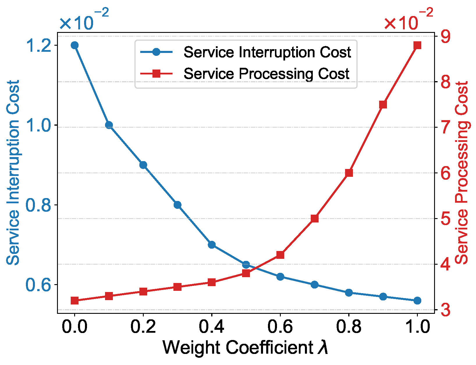 Figure 3. Effect of the weight coefficient λ . Increasing λ decreases service interruptions but increases processing cost, whereas a smaller λ yields the opposite trend. An intermediate value of λ provides a good trade-off between latency and migration overhead.
