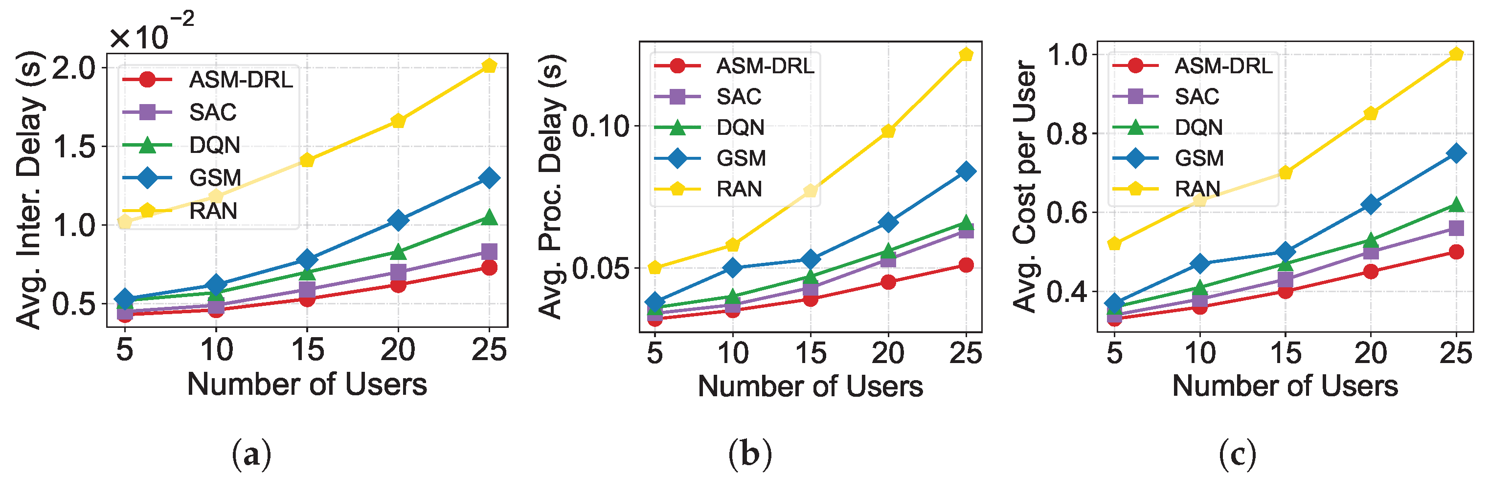Figure 5. Performance comparison of ASM-DRL and baseline algorithms under different user numbers: (a) average service interruption delay, (b) average processing delay, and (c) average cost per user. ASM-DRL consistently achieves lower latency and cost, demonstrating superior advantages with increasing the number of users.