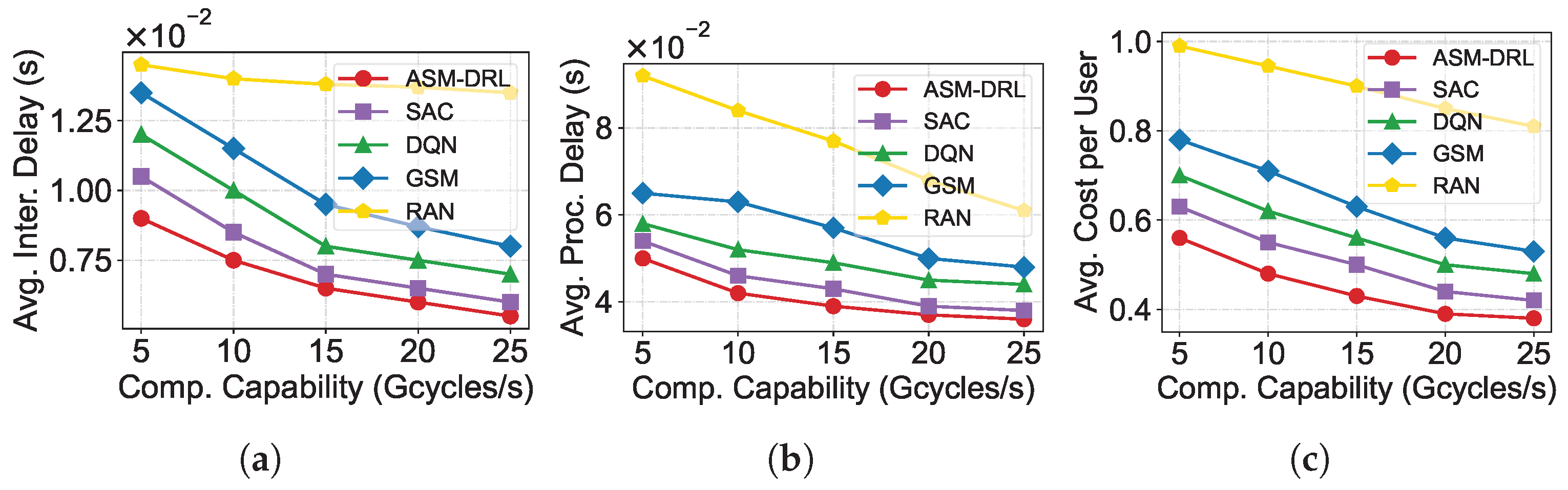 Figure 6. Performance comparison of ASM-DRL and baseline algorithms under varying satellite computing capabilities: (a) average service interruption delay, (b) average processing delay, and (c) average cost per user. As computing capability increases, all approaches achieve better performance, while ASM-DRL consistently maintains the best overall results.