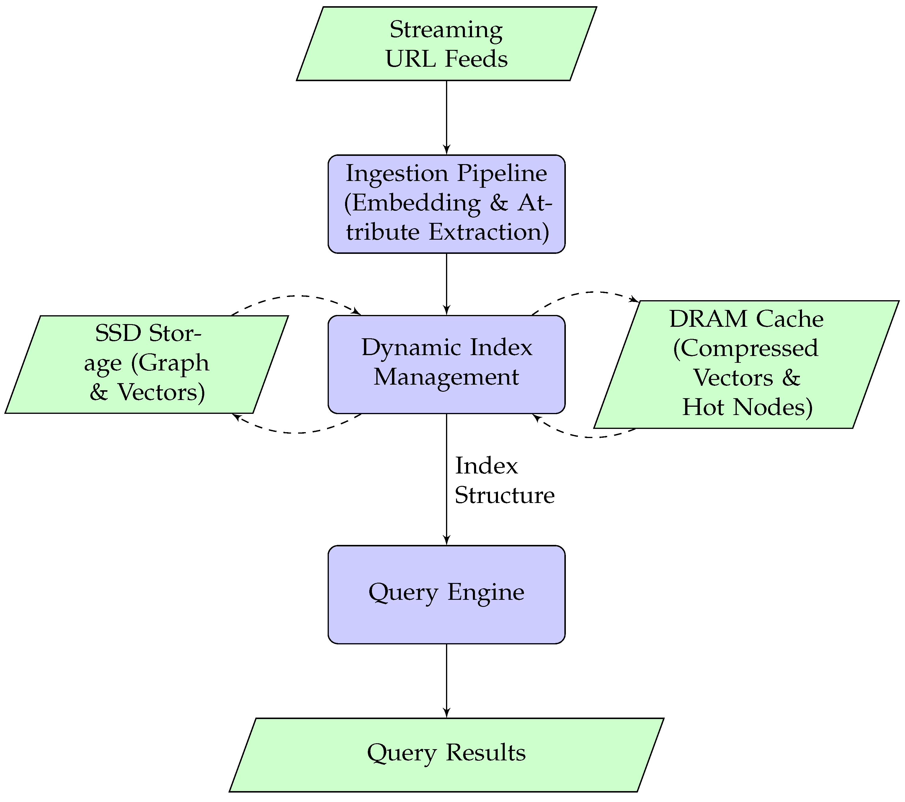 The Velocity of Streaming Data: The threat landscape is in constant flux. New malicious URLs are discovered at a rate of thousands per minute, while old, inactive ones must be pruned. The index must support a high throughput of real-time updates—both insertions and deletions—to ensure that query results are “fresh” and reflect the current state of threats. Stale data is not just unhelpful; it is dangerous, as it can lead to missed detections. Static indexes that require periodic, full rebuilds are operationally infeasible. The process of re-indexing a billion-point dataset can take many hours or even days, during which the system is either offline or serving outdated results. This necessitates an index designed for dynamic, streaming data, drawing inspiration from systems like
