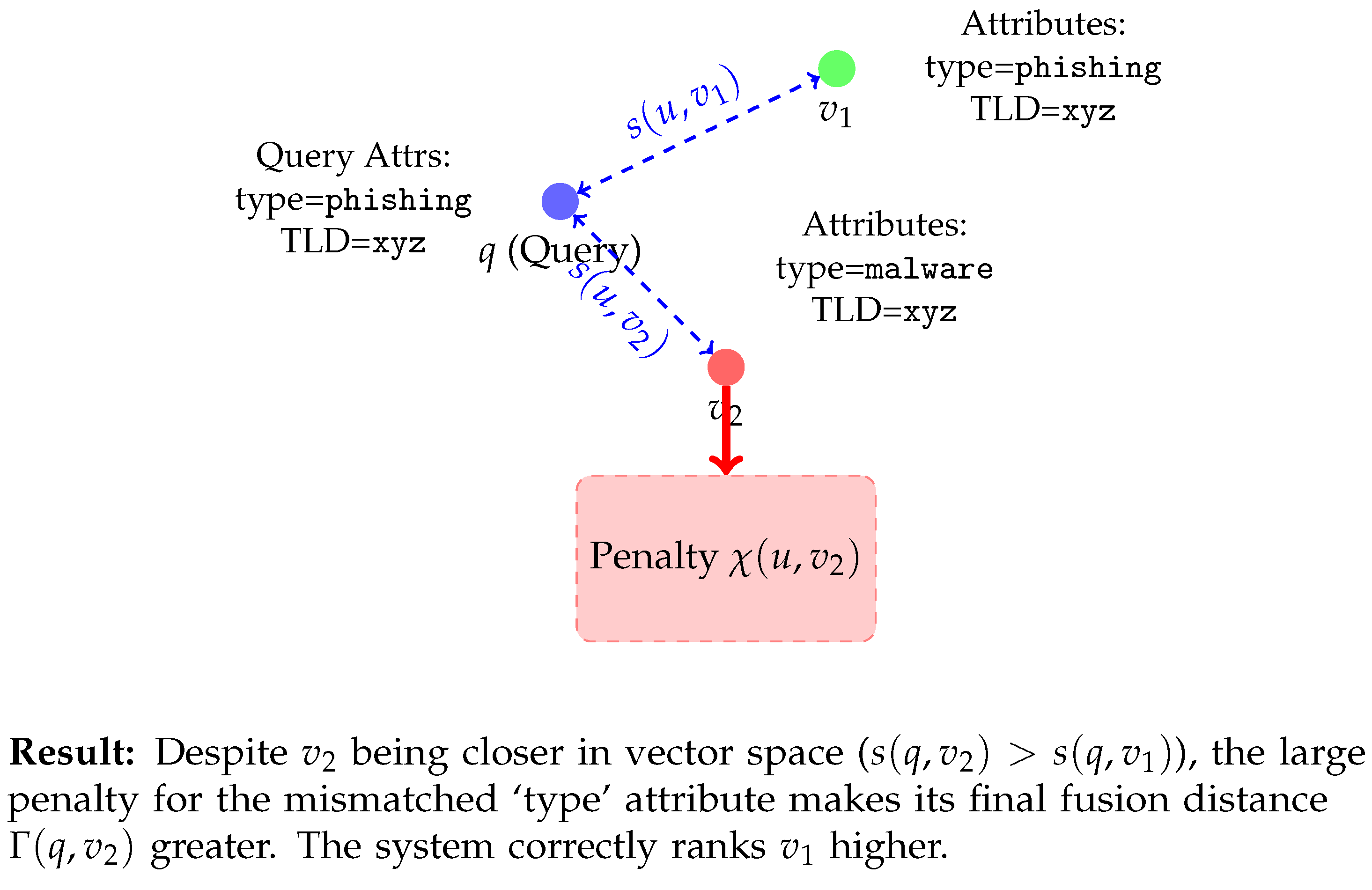 5], acts as the unifying mechanism, calculating a holistic dissimilarity score that is a weighted combination of the continuous semantic distance (from the vectors) and a discrete penalty for mismatches in these categorical attributes. This is paramount for catching critical domain-specific similarities that a purely semantic search would miss. It allows an analyst to query not just for “URLs that look like this phishing attempt” but for “URLs that function like this phishing attempt,” ensuring that the retrieved neighbors share not only the same general topic but also the same malicious classification, making the results immediately actionable for threat hunting and campaign analysis. The fusion distance