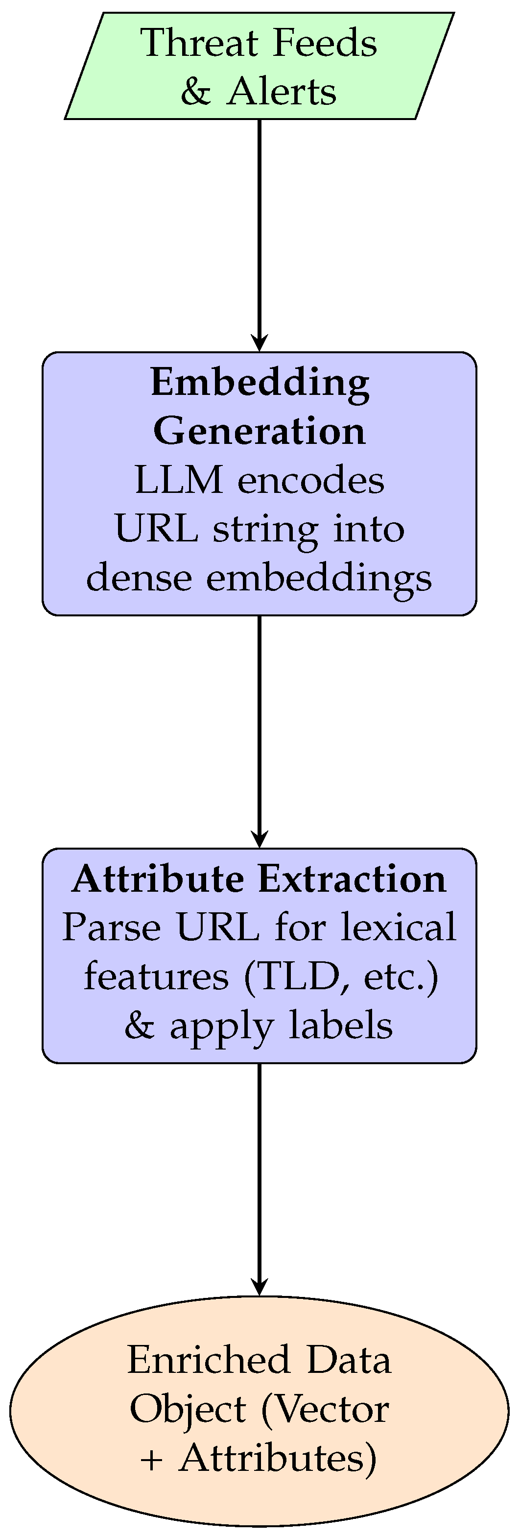 6], to distill the complex, often obfuscated, string of a URL into a dense numerical vector, or embedding. During this process, the model captures not just the words present but also the subtle relationships, structural patterns, and contextual cues that define the URL’s purpose. In the resulting high-dimensional vector space, geometric proximity is synonymous with semantic similarity; the two aforementioned phishing URLs would be mapped to points that are very close to one another. However, semantic similarity alone is insufficient for the nuanced demands of threat intelligence. A pure vector representation might correctly identify that two URLs are both about “PayPal,” but it cannot inherently distinguish a malicious phishing page from a legitimate security blog post written by PayPal’s own team, as both are topically related. This is where the explicit storage of structured attributes becomes critical. For each URL, alongside its dense embedding, we extract and store a set of domain-specific metadata—such as