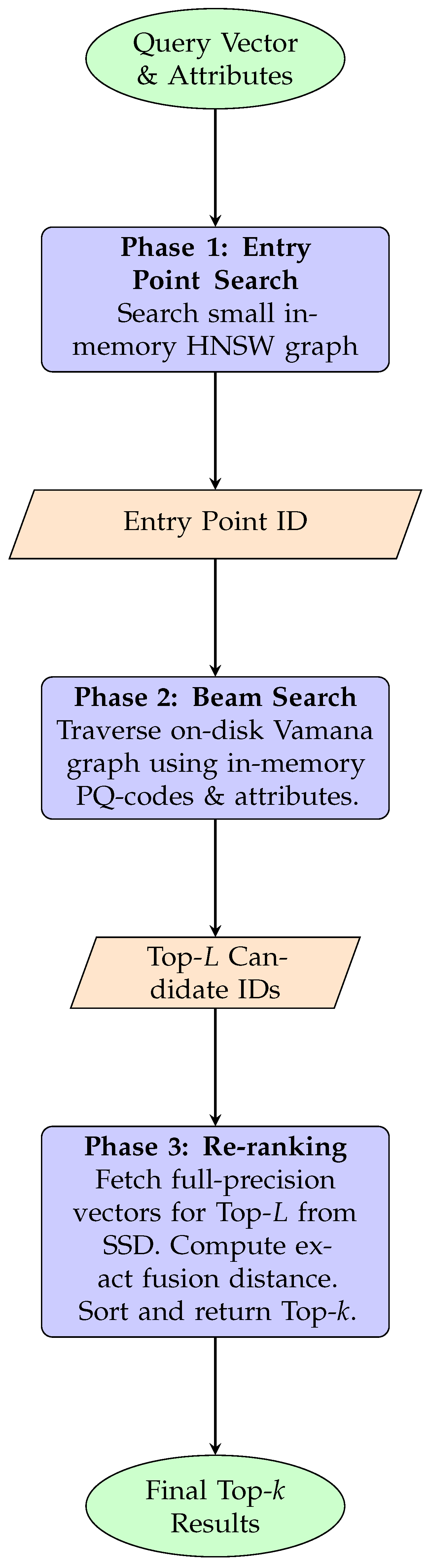 8], which is detailed in the following section. This allows the search traversal to be guided by fast, in-memory distance calculations, with expensive disk I/O and full-precision computations performed only on a small candidate set during a final re-ranking phase. The process can be broken down into three main stages:
