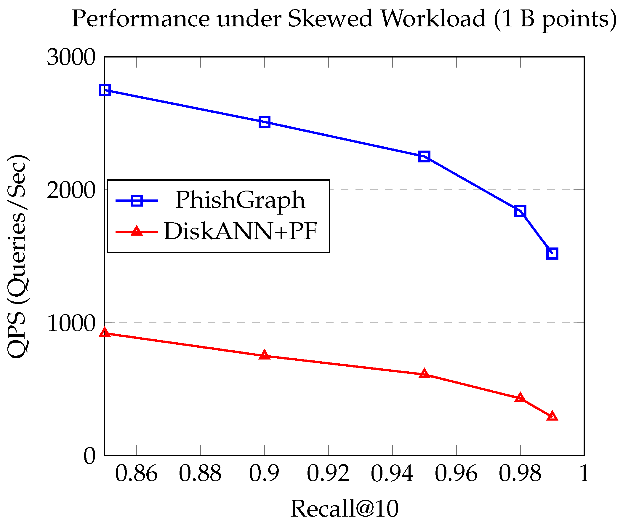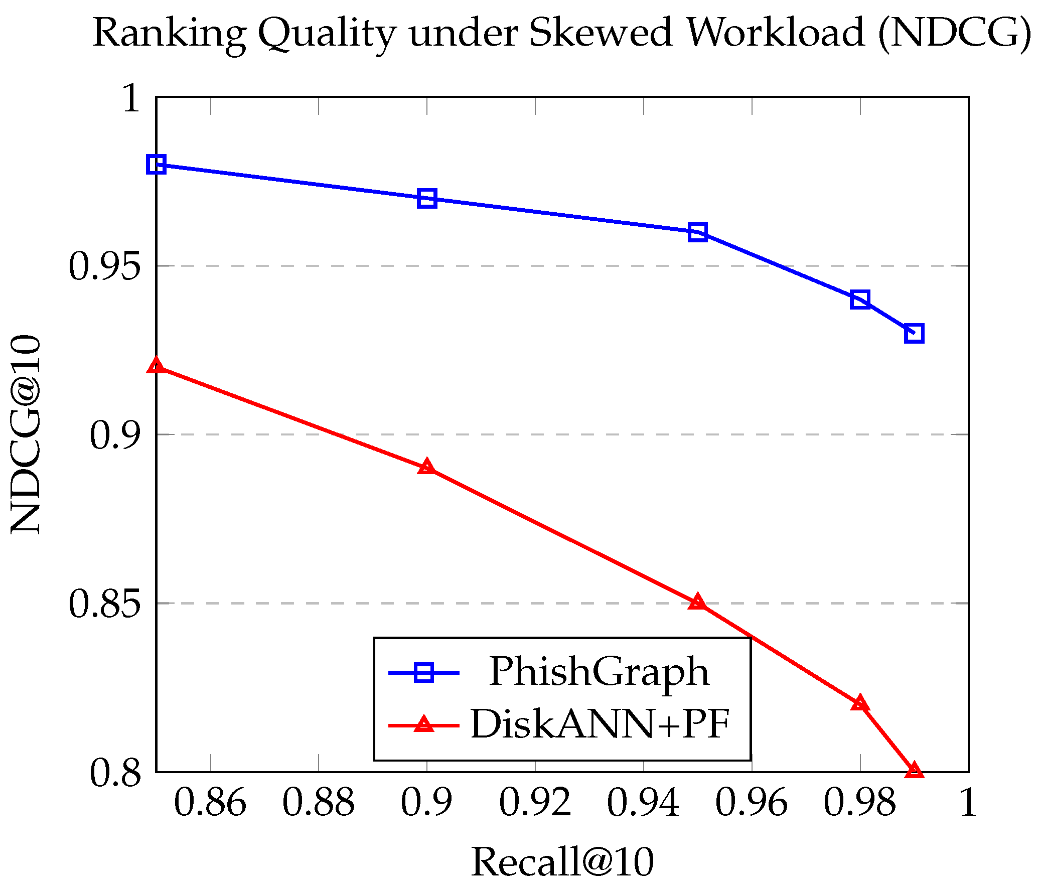 Figure 7, PhishGraph not only maintains higher throughput but also delivers a superior ranking quality, with its NDCG@10 score remaining stable under the skewed workload. In contrast, the DiskANN+PF baseline’s ranking quality degrades significantly, as the post-filtering approach fails to effectively rank the correct items at the top when the initial vector search results are polluted with irrelevant (but semantically close) neighbors.