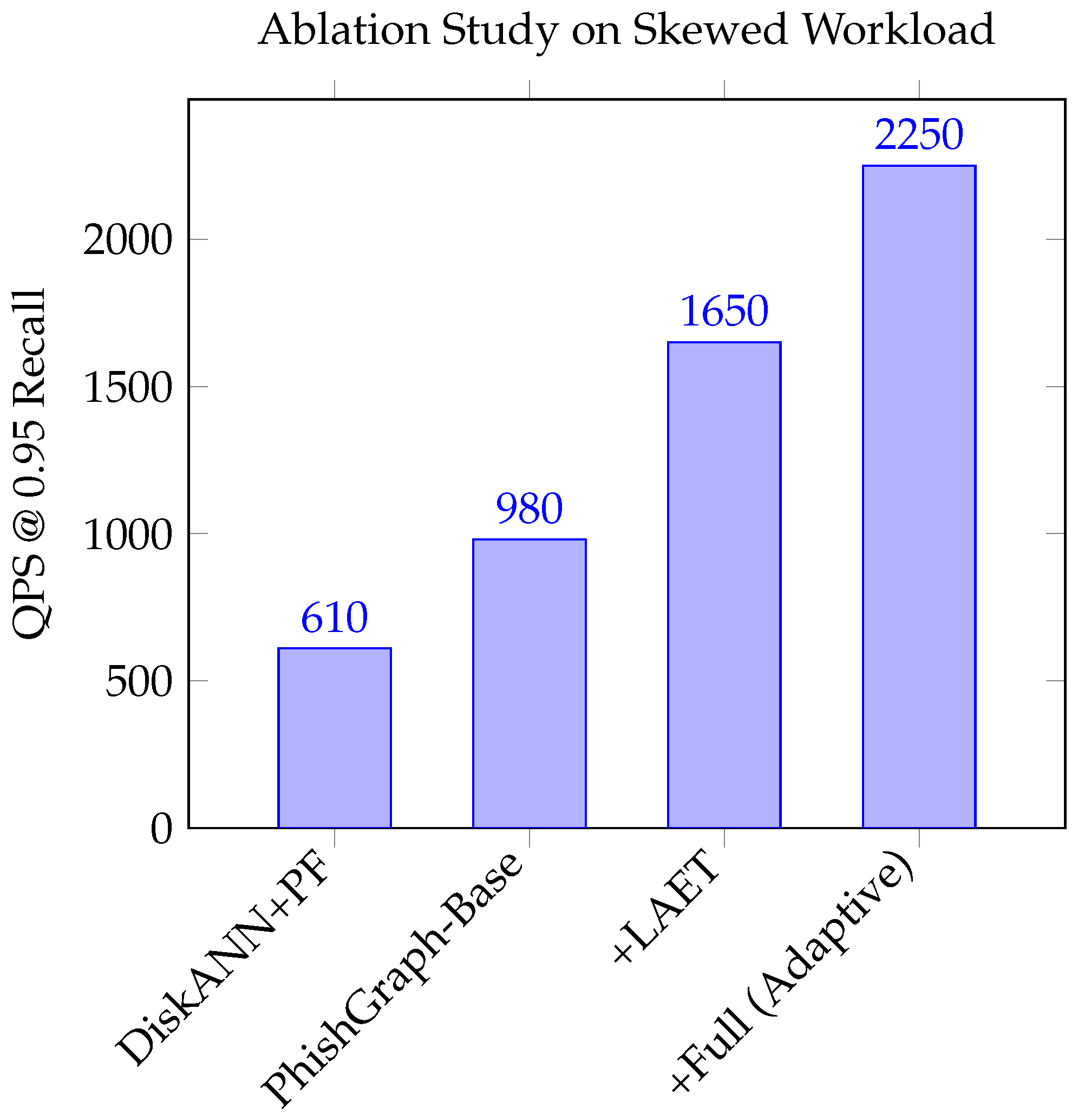 Figure 6 illustrates the performance trade-off under the challenging skewed workload. This test, which mimics an analyst’s focused investigation into an active threat campaign, causes a catastrophic performance collapse for the static baseline system. The DiskANN+PF architecture, unable to adapt to the concentrated query pressure on a small subset of the index, suffers a massive 72% drop in throughput as its P99 latency more than triples. This is a classic symptom of resource contention in a non-adaptive system. In stark contrast, PhishGraph’s performance remains remarkably stable and robust, with its QPS dropping by less than 10%. This resilience is not accidental; it is the direct result of the synergy between its adaptive components.