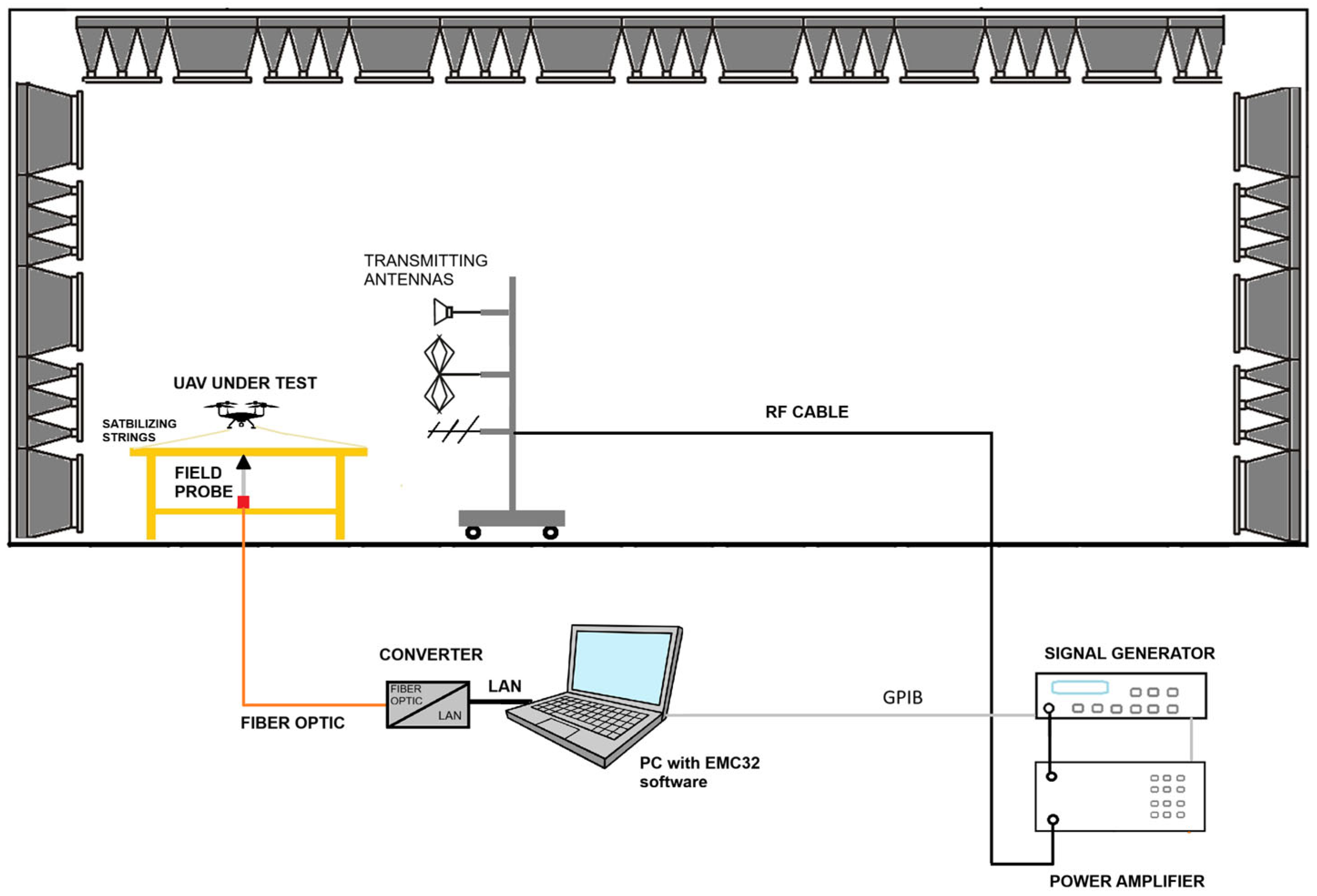 1]. According to its provisions, all electrical and electronic devices, including UAVs, must be designed in a way that allows them to function properly in a predictable electromagnetic environment, without causing excessive electromagnetic interference that could interfere with the operation of other devices. In practice, this means that drones should be resistant to at least an electromagnetic field strength of 10 V/m in the frequency range from 80 MHz to 6 GHz, which results from the requirements of the IEC 61000-4-3 standard [