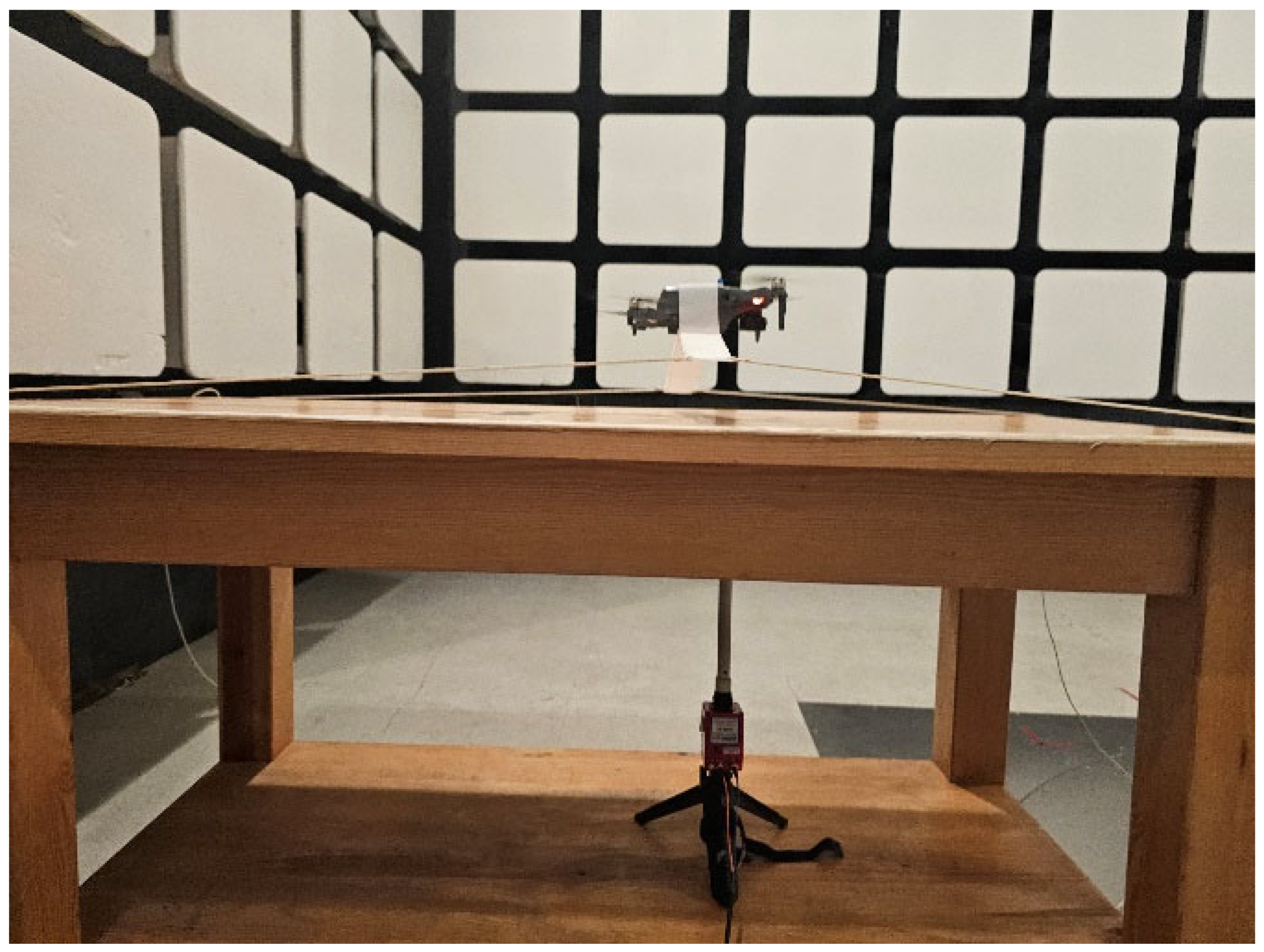 Figure 3. During flight, the drone was exposed to increasingly stronger electromagnetic fields until it descended onto the table. The tape used ensured that no damage occurred to the walls of the anechoic chamber in the event of a loss of flight control.