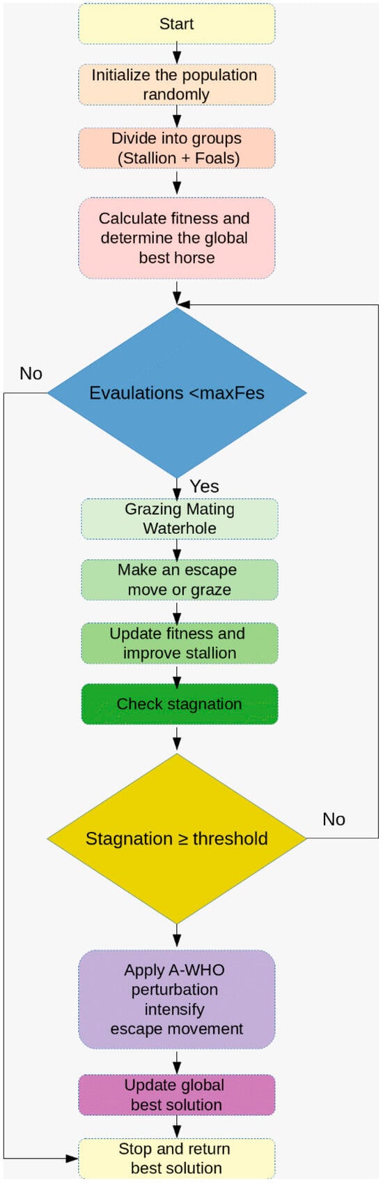 In WHO, the population is divided into distinct age groups (e.g., foals, young horses, adults, and elderly horses), with each group contributing differently to the optimization process. The algorithm incorporates a range of behavioral strategies such as grazing, following the leader, imitation, and random roaming to guide the search process. Despite delivering promising results for high-dimensional optimization problems, WHO is highly sensitive to parameter tuning, and due to its large parameter set, it may become vulnerable to premature convergence and local minima.