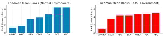 These findings clearly demonstrate that the proposed A-WHO algorithm consistently delivered the best performance in both normal and DDoS environments, with statistical significance. The Friedman mean rank results for both environments are shown in Figure 3.