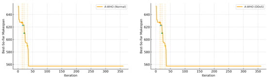 To provide a clearer illustration of the stagnation-handling behavior, Figure 4 shows the convergence curves of A-WHO for 20 iterations under normal and DDoS environments. Since the stagnation-aware mechanism is unique to WHO-based schedulers, convergence plots are presented only for A-WHO, as other algorithms do not incorporate stagnation-triggered diversification logic. In normal conditions, A-WHO rapidly converges without oscillation, while under DDoS, the curve shows temporary fluctuations caused by resource exhaustion yet successfully escapes stagnation and achieves a lower final makespan. Colored triangle markers represent adaptive trigger events where the stagnation threshold is reached, prompting leader perturbation. Orange triangles indicate stagnation detection points, while blue triangles represent adaptive perturbation events triggered to escape local minima. The 20-iteration case is shown for clarity and is representative of the overall trend observed in long runs.
