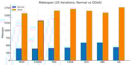 Makespan comparison of scheduling algorithms under normal and DDoS conditions (20 iterations).