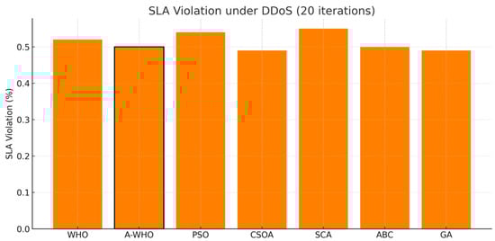 After analyzing the makespan results, the SLA violation percentages are illustrated in Figure 6. In the normal environment, there are no SLA violations because SLA thresholds were not exceeded under stable traffic conditions; however, there are significant SLA violations in the DDoS cases. The SLA violation triggers were configured to ensure that only attack-driven degradations SLAs are applied, using thresholds set in the recent literature on cloud scheduling. The A-WHO and CSOA schedulers achieve the lowest SLA violation ratios, providing better service continuity and QoS protection, even during attack-induced resource exhaustion.
