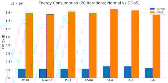 Energy consumption trends are illustrated in Figure 7, where DDoS conditions cause a significant rise in energy usage across all algorithms. Despite this increase, A-WHO ranks among the most energy-efficient schedulers in both environments. By avoiding prolonged stagnation and reducing overhead idle time, the proposed method minimizes unnecessary energy waste and sustains a more balanced utilization profile compared to WHO, PSO, and other swarm-based optimizers.