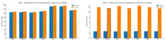 Finally, Figure 8 summarizes the QoS metrics, including execution time and response time. As expected, DDoS attacks lead to sharp increases in both indicators; however, A-WHO maintains noticeably lower latency and faster execution than the competing algorithms. These findings confirm that the adaptive stagnation-aware strategy not only accelerates convergence but also stabilizes end-to-end service performance under adversarial conditions.