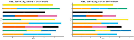 Gantt chart illustrating the scheduling of tasks under normal and DDoS conditions using the WHO algorithm.