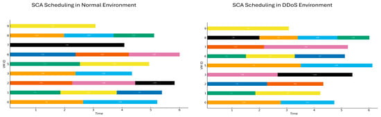 Gantt chart illustrating the scheduling of tasks under normal and DDoS conditions using the SCA algorithm.