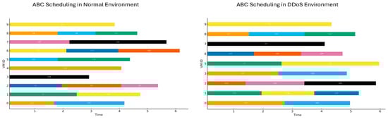 Gantt chart illustrating the scheduling of tasks under normal and DDoS conditions using the ABC algorithm.