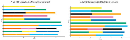 Gantt chart illustrating the scheduling of tasks under normal and DDoS conditions using the A-WHO algorithm.