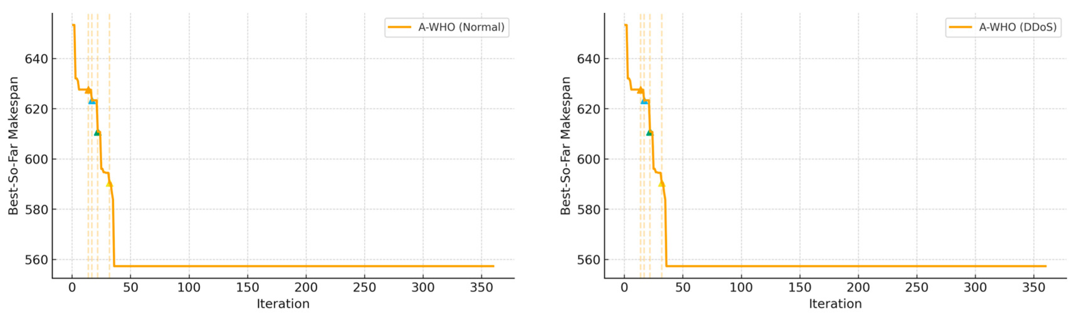 - Enhanced WHO Algorithm: We introduce Adaptive-WHO (A-WHO), an improved version of the standard WHO algorithm, which integrates a stagnation-aware adaptive diversity mechanism. This adjustment significantly reduces the risk of premature convergence and, thus, improves scheduling effectiveness during normal and adversarial conditions.