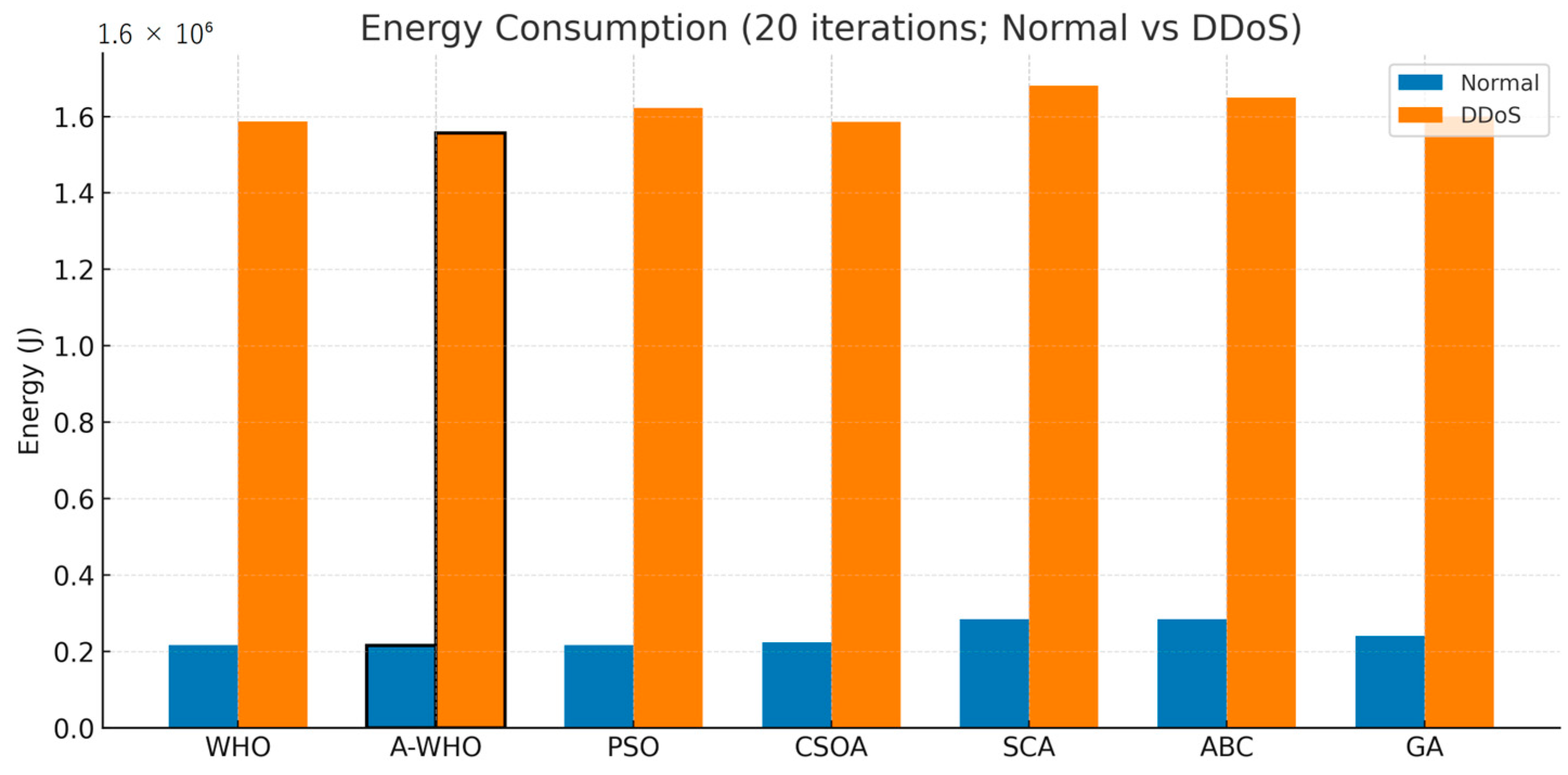 | Algorithm | Energy (J) Normal | Energy (J) DDoS |