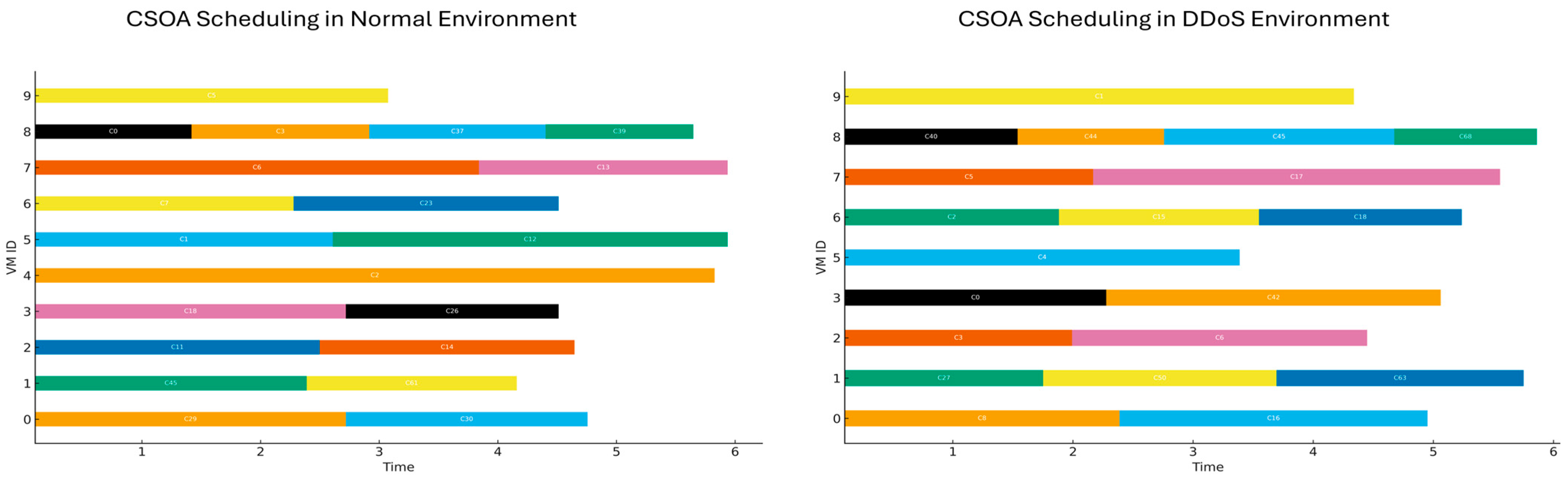 - At the 10-iteration level, CSOA (47.58 s) and ABC (47.53 s) achieved the shortest execution times, whereas GA (9 min 33 s) required the longest completion time. Under DDoS attacks, execution times increased for all algorithms, with GA (15 min 41 s) experiencing the largest rise.
