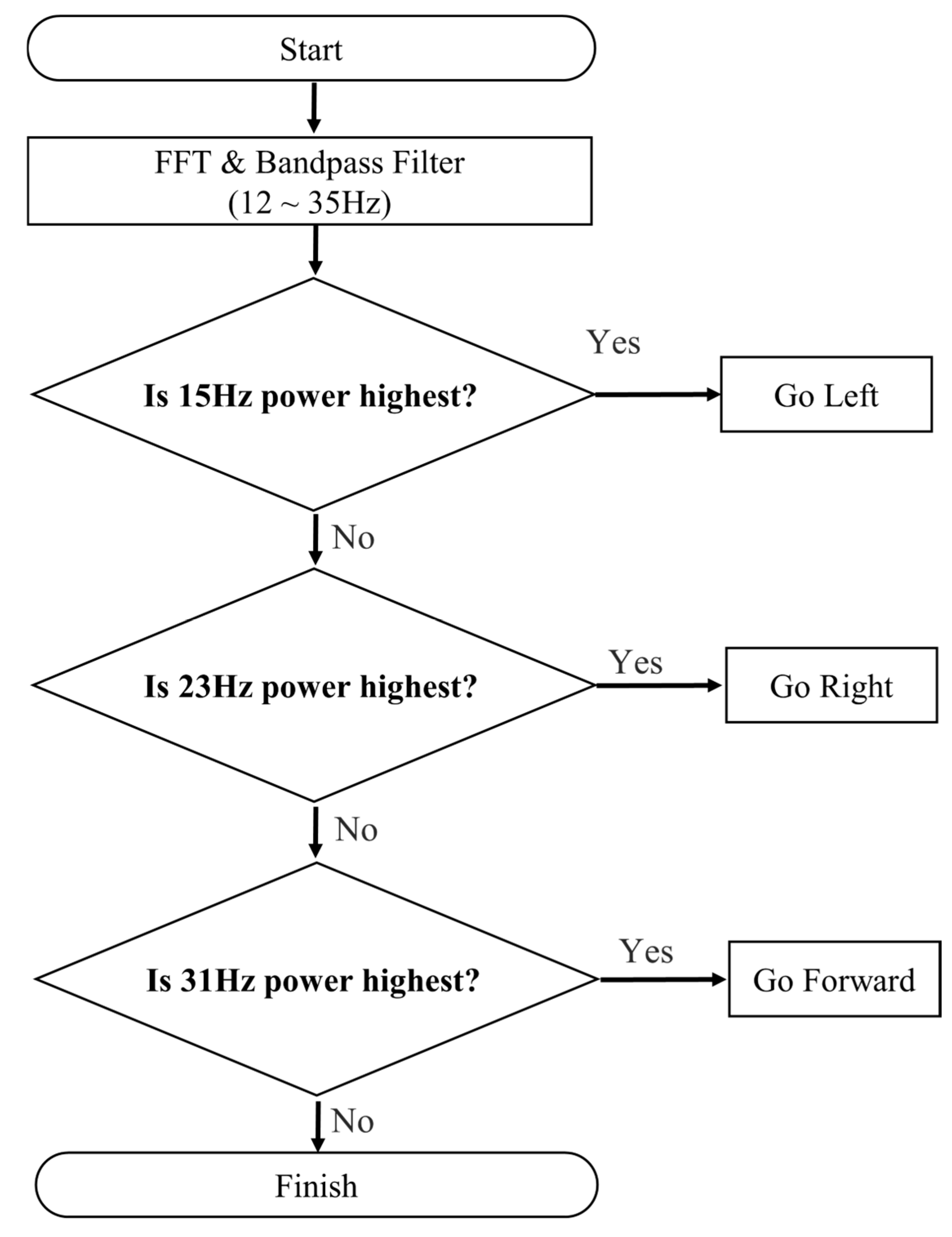 | 1 //procedure 2 Set variable blink start time ,, flag, time seriest; 3 while (Obtain time series t of EOG signal recording) 4 { 5 if (EOG has high amplitude) then //blink occurs 6 { 7 save blink start time 8 save blink stop time ; 9 flag set true; 10 } 11 if (flag == true) then 12 { 13 delete EEG times of signal during ~; 14 flag set false; 15 Execute FFT on the EEG signal 16 If 15 Hz power is the highest, then 17 { 18 Go Left; 19 } 20 else if 23 Hz power is highest, then 21 { 22 Go Right; 23 } 24 else if 31 Hz power is highest, then 25 { 26 Go Forward; 27 } 28 else 29 { 30 Do Nothing; 31 } 32 } 33} 34//end procedure |