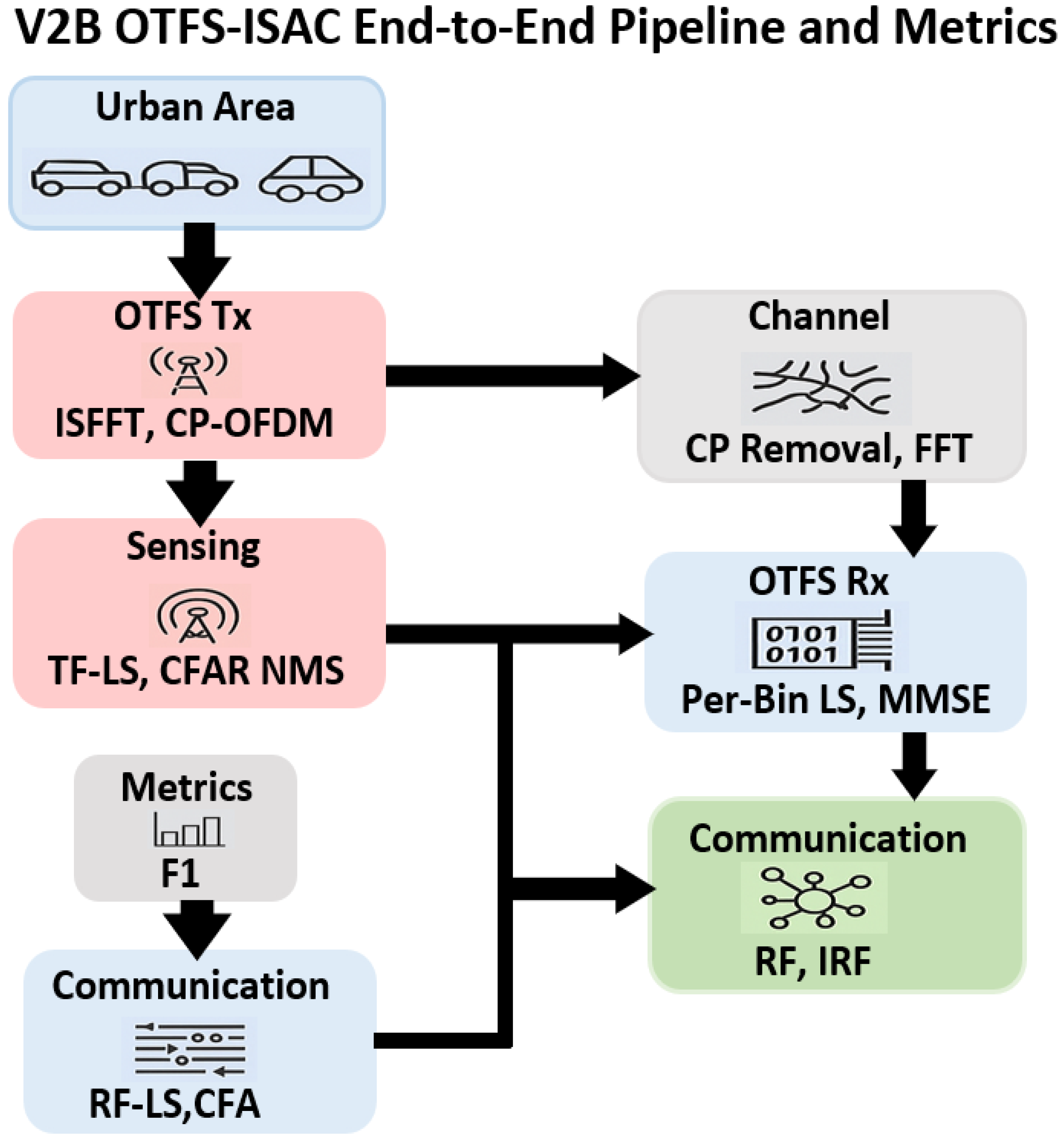 The V2B link adopts a full OTFS chain, explicitly parameterized through transmitter, receiver, and sensing steps. All parameters are explicitly set via the CLI. The transmitter computes and logs derived lattice quantities—subcarrier spacing , OFDM symbol duration , CP-extended symbol duration , and Doppler resolution —and, when aligned with the dataset, verifies that the CP length covers the maximum path delay, i.e., .