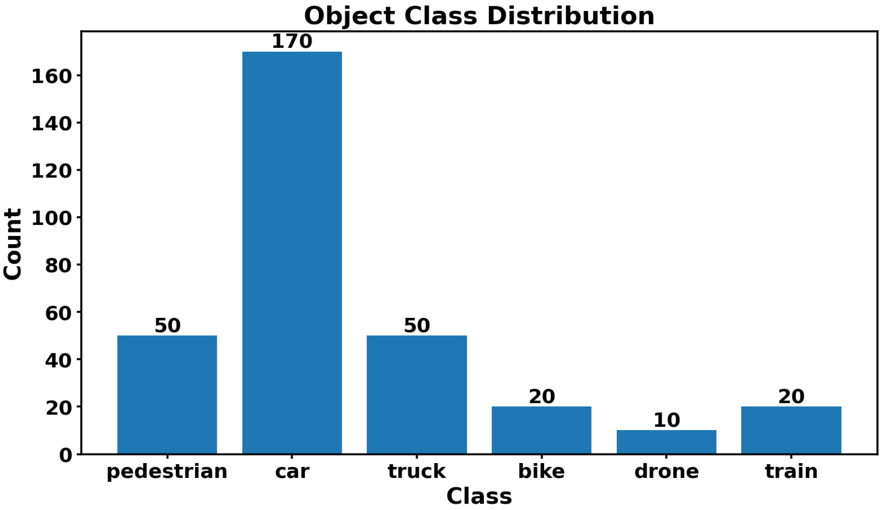 dynamic objects drawn from six classes: car, truck, pedestrian, bike, drone, and train. The configured distribution of classes—car 55%, pedestrian 18%, truck 12%, bike 6%, drone 5%, and train 4%—is shown in
