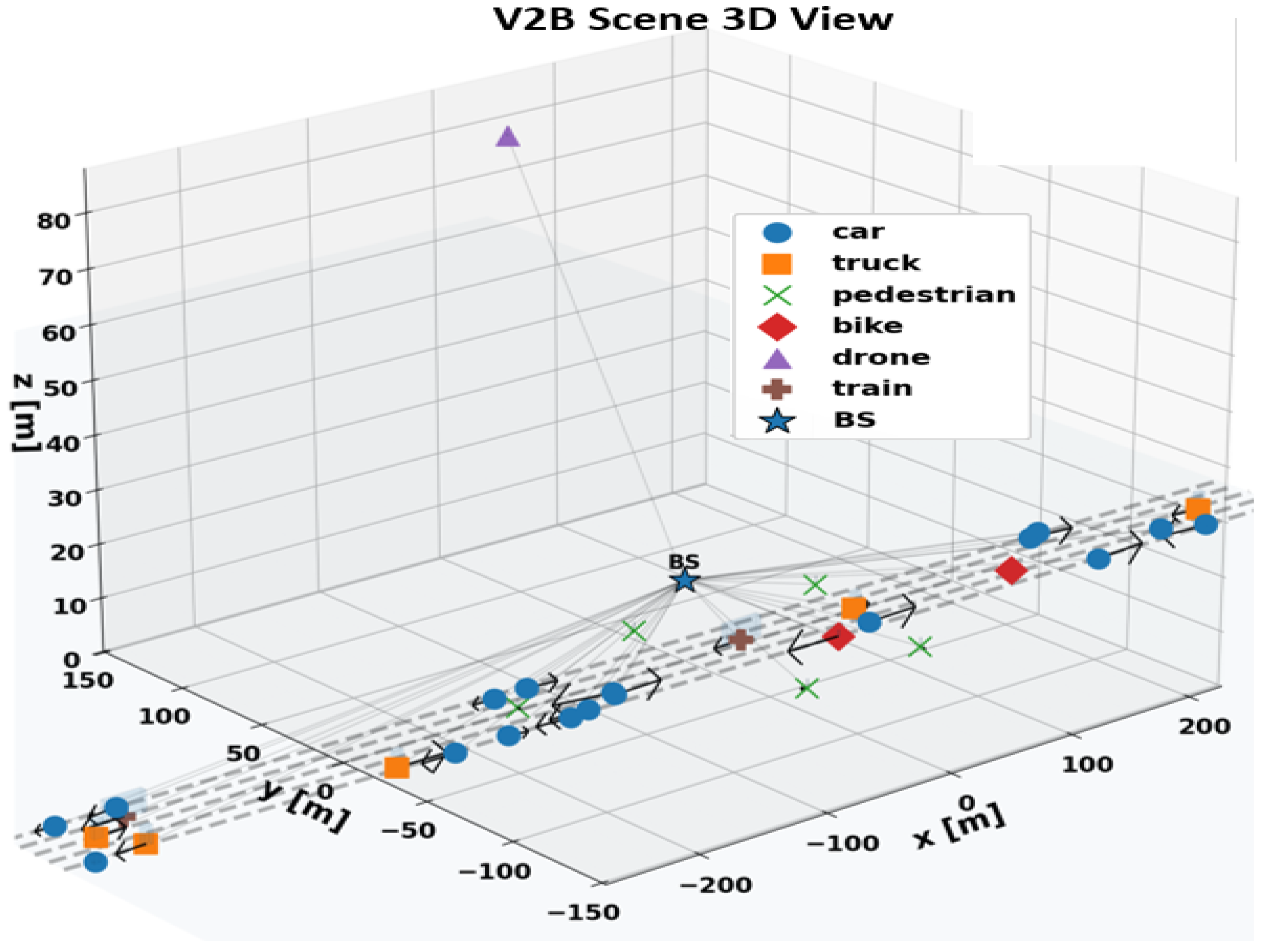 Kinematics and motion models. Cars, trucks, bikes, and trains follow the CTRV model, pedestrians alternate between CA and NCV, and drones employ NCV with altitude variation. Vehicle speeds span – (–), pedestrians –, and drones 3– with altitudes of 15–. For every object and frame, the generator computes the full kinematic state—3D position , velocity v, acceleration a, yaw–pitch–roll, heading, bearing, and elevation—forming the base geometry of all subsequent RF calculations.