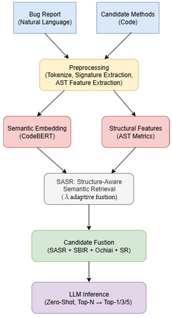 - SASR-only: This group isolates the contribution of the proposed structure–semantic retrieval method. By combining CodeBERT-based semantic embeddings [13] with AST-based structural embeddings [16,17,32], SASR re-ranks candidates and restricts the LLM input to the top 20 functions. This setup directly addresses RQ2 by quantifying the impact of structural information alone.