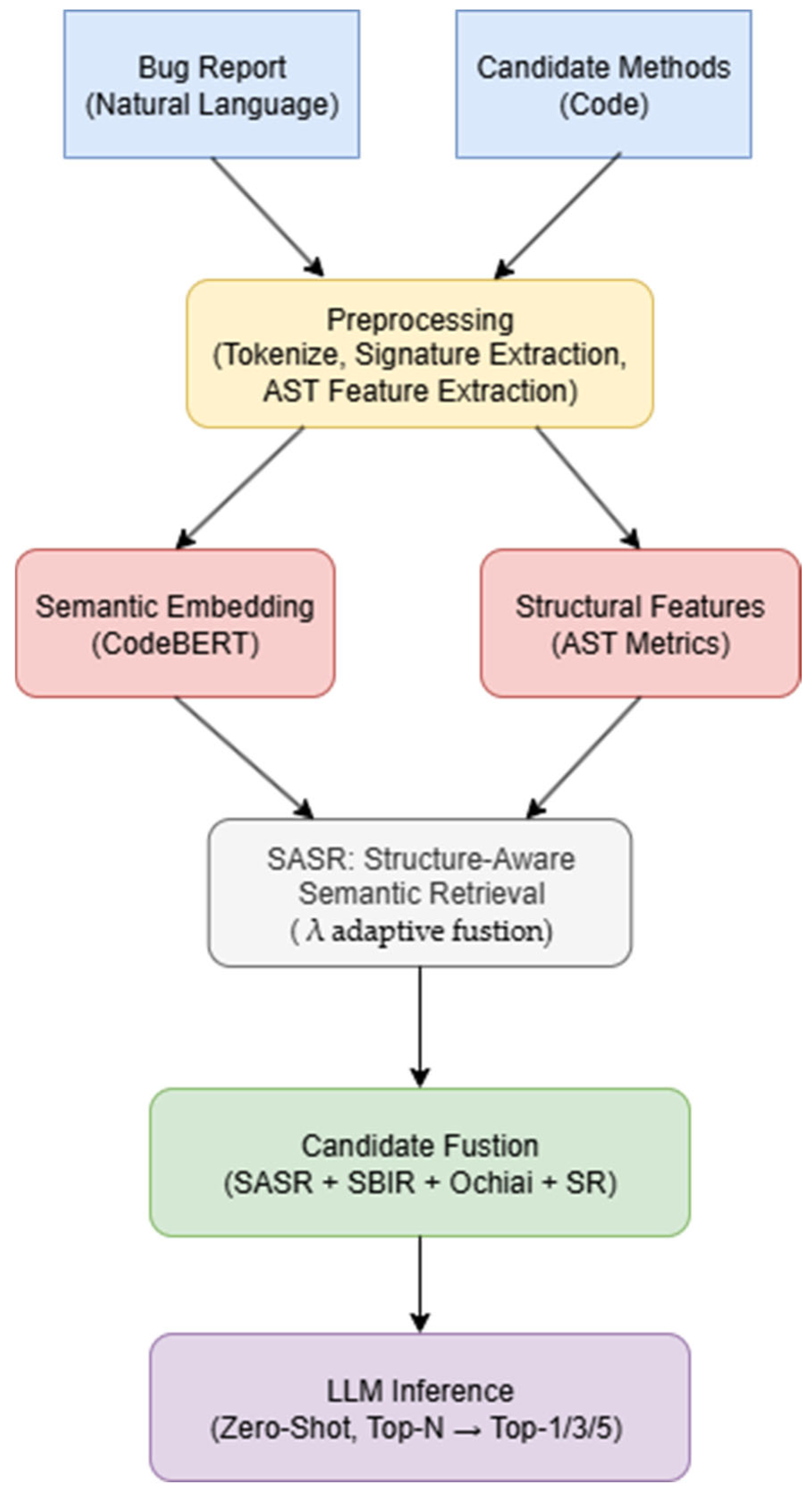 - Baseline LLM: This group directly inputs the bug report and the entire method corpus (on average about 8000 methods) into a single prompt without incorporating any structural signals or retrieval preprocessing [11,12,28]. It provides the minimum performance benchmark of a purely LLM-based approach and serves as the control group for RQ1.