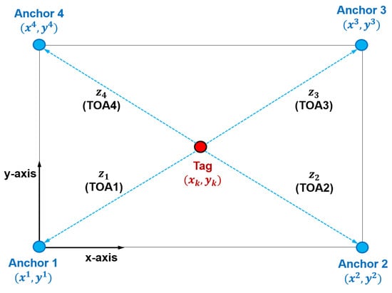 UWB-WSN systems are composed of devices that transmit and receive UWB signals. Anchors are installed at fixed locations within indoor spaces, and their coordinates are provided to the localization system. Tags, which are mobile devices, are attached to objects whose locations are to be tracked. UWB signals are transmitted and received between the anchors and tags, and the tag’s position is calculated using the measurements obtained during this process. The parameters measured in WSNs include the time of arrival, time difference of arrival, angle of arrival, and received signal strength. In this study, we consider the most commonly used parameter, i.e., TOA. As shown in