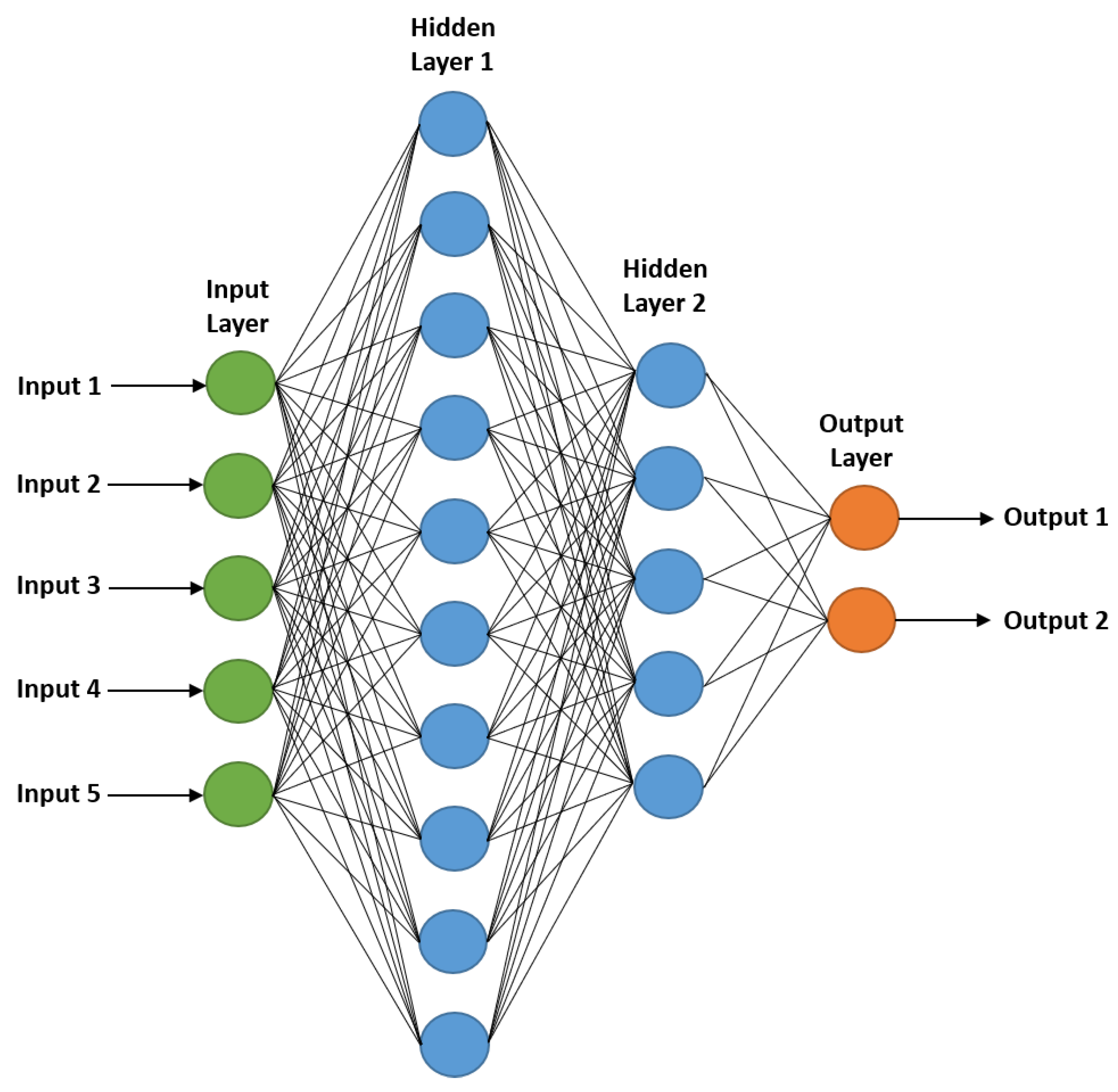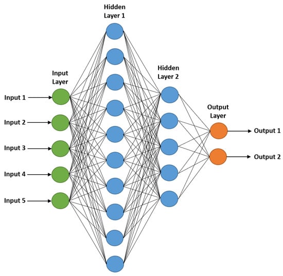 and AOE for the four anchors. The neural network has two output nodes, classifying the PF state into two categories: failure and normal. If the number of hidden layer nodes is too large, computational load increases, slowing processing speed. Therefore, we used 10 nodes in the first hidden layer (twice the number of input nodes) and 5 nodes in the second hidden layer (half the number of the first hidden layer). The neural network structure is shown in